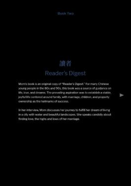 Mom's book is an original copy of "Reader's Digest." For many Chinese young people in the 80s and 90s, this book was a source of guidance on life, love, and dreams. The prevailing aspiration was to establish a stable, joyful life centered around family, with marriage, children, and property ownership as the hallmarks of success.
