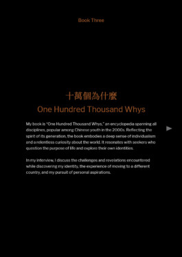 My book is “One Hundred Thousand Whys," an encyclopedia that spans all disciplines. Reflecting the spirit of my generation, it caters to our deep individualism. We are seekers, constantly questioning the purpose of life and exploring our own identities.